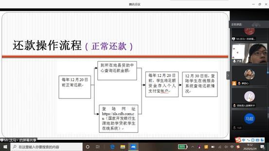 (通讯员 黄昕宇)6月24日上午9时,为帮助mg4355官网2020届毕业生了解生源地贷款还款流程。资助专干严星老师在腾讯会议平台上召开2020届毕业生生源地贷款还款流程讲解会,对2020届进行生源地贷款的毕业生详细讲解生源地贷款还款须知。